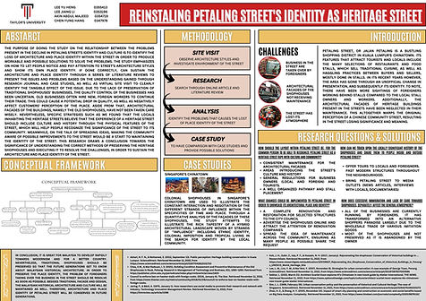In a group of 4, we were assigned to do an in-depth, research on a street, extracting the issues that are present in the street and provide solutions with understanding the thesis regarding the issue that has arisen and been identified in that street. We were assigned to propose the statement of issue and solution before proceeding with our infographic research poster and video presentation.